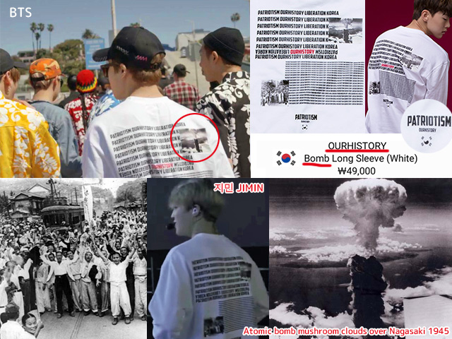 韓国のアパレル通販サイト「ourhistory」では、JIMINが着用していたTシャツと同じデザインの商品が販売されている。Tシャツには英語で「OURHISTORY」「PATRIOTISM」の文字と、原爆投下の写真、万歳する人々の写真がデザインされている。価格は49000ウォン(約5000円)と表示されている。