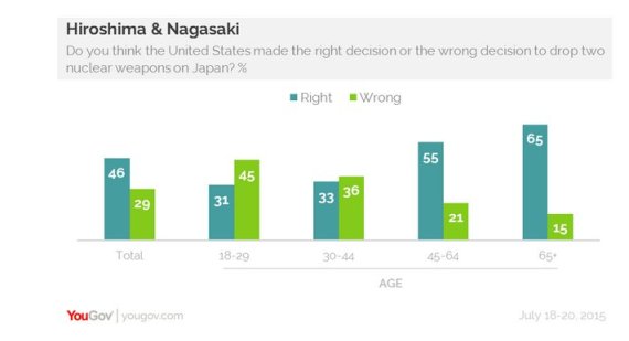 若い世代では原爆投下を批判する見方が強く、18~29歳と30~44歳の年齢層では、原爆投下を「誤り」とする回答がそれぞれ45%、36%を占め、「正しい」とするそれぞれの31%、33%を上回った。