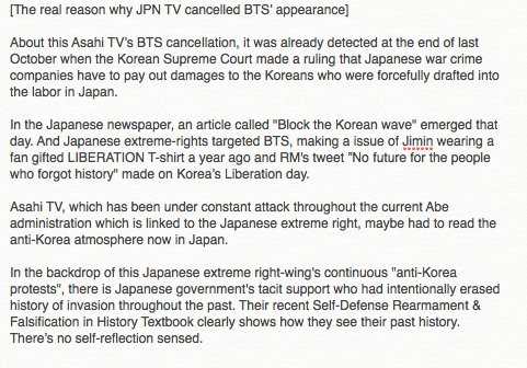 韓国人がまた世界で嘘をつくのか。BTSのテレビ出演に政府の意思なんか関係ねえよ。単にテレビ朝日に山程のクレームが入っただけ。そもそもテレビ朝日は政府の言うことなんか聞く連中じゃないし、韓国とスワップ結んでやれとか韓国との友好がとかいい続けて安倍政権批判ばかりしてるメディアだよ。そいつらが前日のギリギリに出演取り止めるくらいだから相当のクレームが入ったんだろう。大体日本で韓国擁護する連中は戦争反対、アメリカ軍の基地反対、核兵器廃絶、原発反対、貧困救え、LGBT認めろ辺りがセットだ。つまり、日韓友好と原爆がバッティングしちゃったから、国内の怒りと日韓友好を天秤にかけた結果がBTSの出演見送り。まあ、やらかしたBTSに責任が有るから文句は言えないからな。