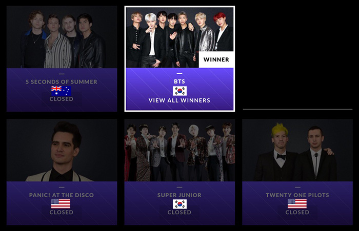 また、防弾少年団のリパッケージアルバムのタイトル曲「アイドル(IDOL)」は、アリアナグランデのノーティアーズ左トゥ・クライ」、ショーン・メンデスの「インマイブラッド」、セレナ・ゴメスの「バック・トゥ・ユー」、カーディガンビー・バッドバニー・Jベルビンの「アイライクイット」を抜いて「今年の歌」部門でウィナーを決めた。