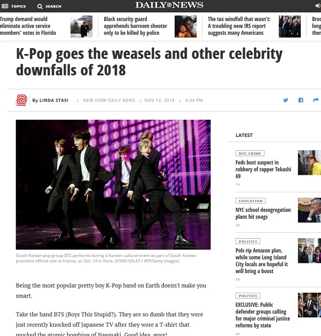 ※元記事の見出し「K-Pop goes the weasels and other celebrity downfalls of 2018」は