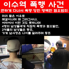 11월 13일 새벽 4시경 서울 이수역의 한 맥주집에서 여성 두명이 맥주를 마시던 중 옆 테이블의 커플이 지속적으로 여성 2명을 쳐다보았다. "왜 쳐다보느냐" 라고 물어봐도 비웃기만 하고 수군거려서 기분이 불쾌해져서 시비가 말싸움으로 번졌고 아무 관련 없는 남자 5명이 말싸움에 끼어들어 여성 2명을 비난하고 공격하였다. 여성 1명은 두개골의 뼈가 보일 정도로 폭행당하고 경찰은 30분 후에야 도착하였다. 가해 남성은 자신 또한 피해자라며 우겼다.