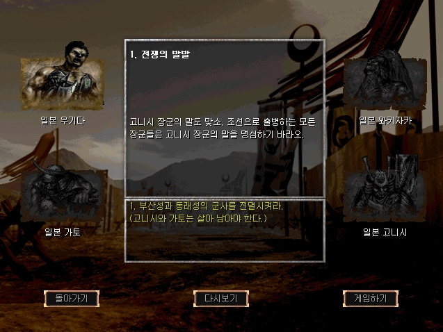 굳이 일본을 비하하려는 의도는 없습니다.게임모드는 싱글플레이, 멀티플레이가 있으며, 싱글 플레이는 조선, 일본, 명나라 각각의 시나리오가 있습니다.