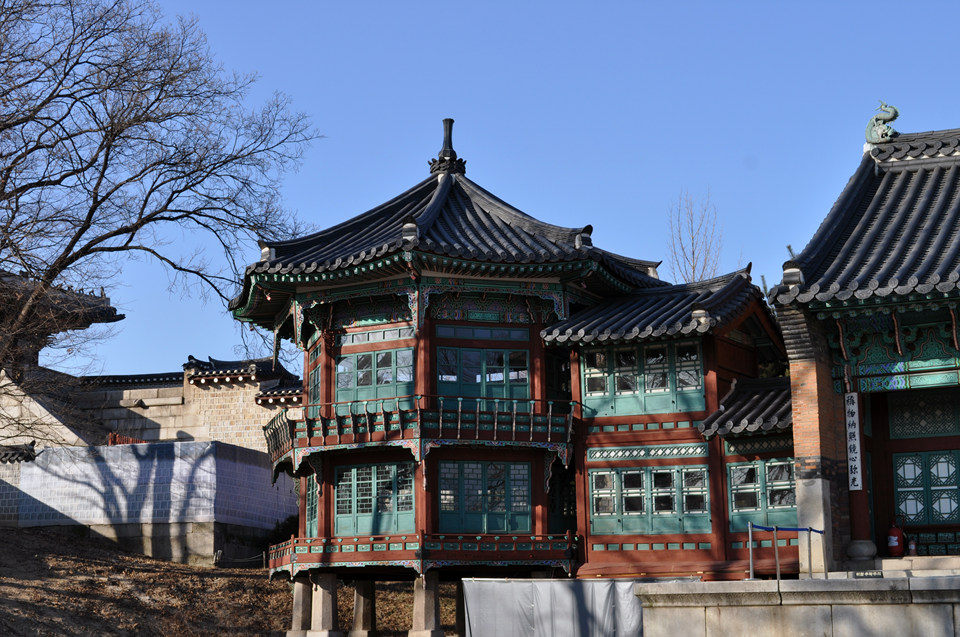 1、韓国の伝統的木造建築の美しさは、柱が少なく、屋根が重厚な点にあります