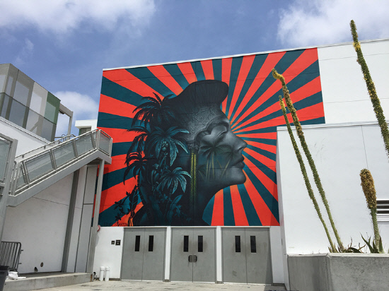 8街[W 8th St]とサウス・ケンモア・アベニュー[S Kenmore Ave]の交差点からRFKスクールを眺めると、旭日旗模様が人とパームツリーを覆っている大型壁画を見ることができる。