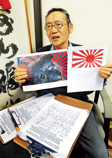光復会アメリカ西南部支会パク・ヨンナム会長は「アメリカの人も日本帝国主義の被害者だ。戦争侵略を象徴する旭日旗模様を公立学校が描いてはならず、容認もしてはいけない」と話した。