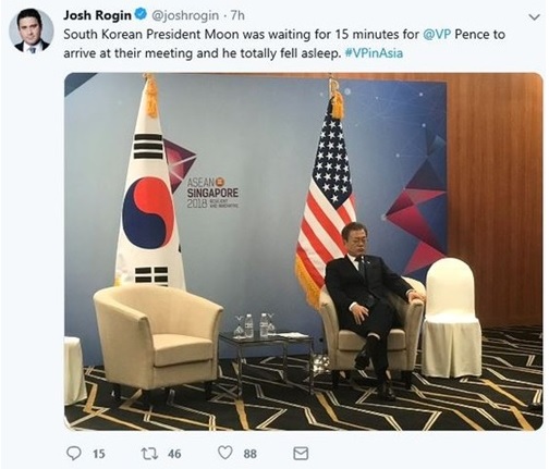 ワシントン・ポスト(WP)の外交・安保担当コラムニストのジョシュ・ロギン氏は15日、ツイッターに文大統領が目を閉じている写真を掲載した。ロギン氏は「文大統領がペンス副大統領の到着まで15分間待っていた。文大統領が完全に眠っている(he totally fell asleep)」とコメントを添えた。