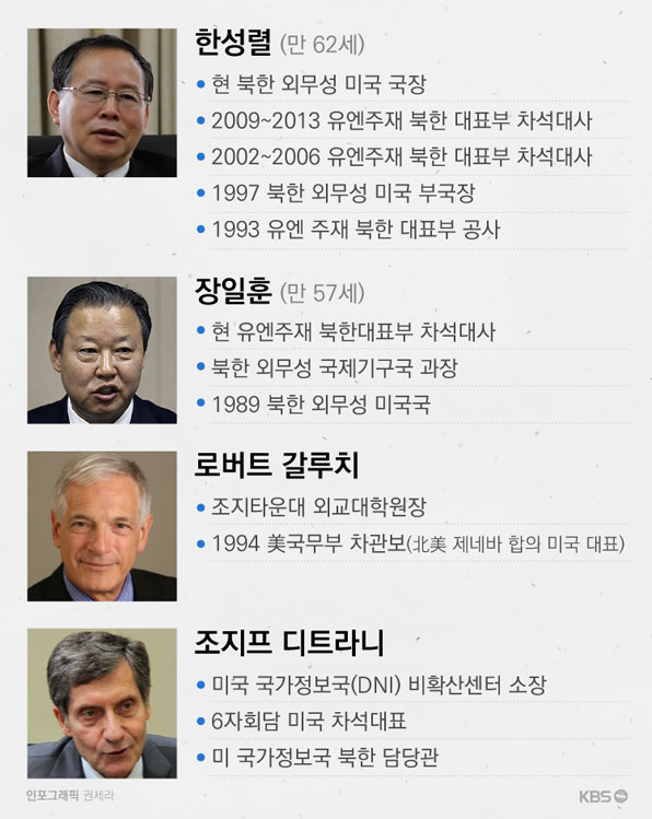 북미 간 극비접촉이 열리는 현장에 접근한 KBS 취재진은 미국 대표단의 면면에 깜짝 놀랐습니다. 1994년 1차 북핵위기 당시 북미 제네바 합의 주역인 로버트 갈루치 전 미 국무부 북핵 특사와 6자회담 차석대표를 지낸 북핵 전문가 조지프 디트라니 전 미국 국가정보국(DNI) 비확산센터 소장이었기 때문입니다.