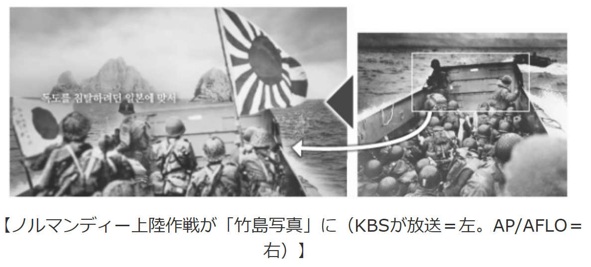 2015年1月にKBS(韓国の公共放送)が放送した教養番組『根深い未来』の予告編映像の画像を見ていただきたい。番組は第2次世界大戦後の竹島の歴史を紹介するもので、「独島を奪おうとした日本」というテロップとともに、旭日旗を掲げた日本軍が竹島を目指す様子を写している(写真左側)。だがこれは、1944年6月のノルマンディー上陸作戦時の写真(同右側)に、旭日旗を持つ日本兵と竹島を合成したものだった。