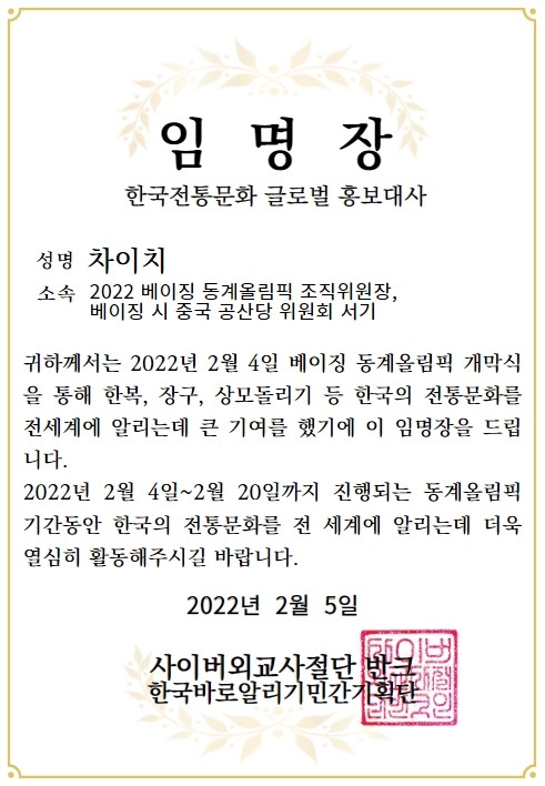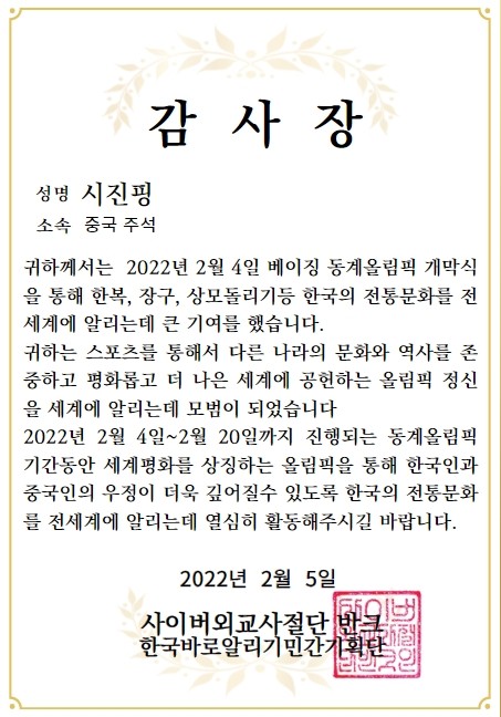 세계평화를 상징하는 올림픽을 통해 한국인과 중국인의 우정이 더욱 깊어질수 있도록 한국의 전통문화를 전세계에 알리는데 열심히 활동해주시길 바랍니다.