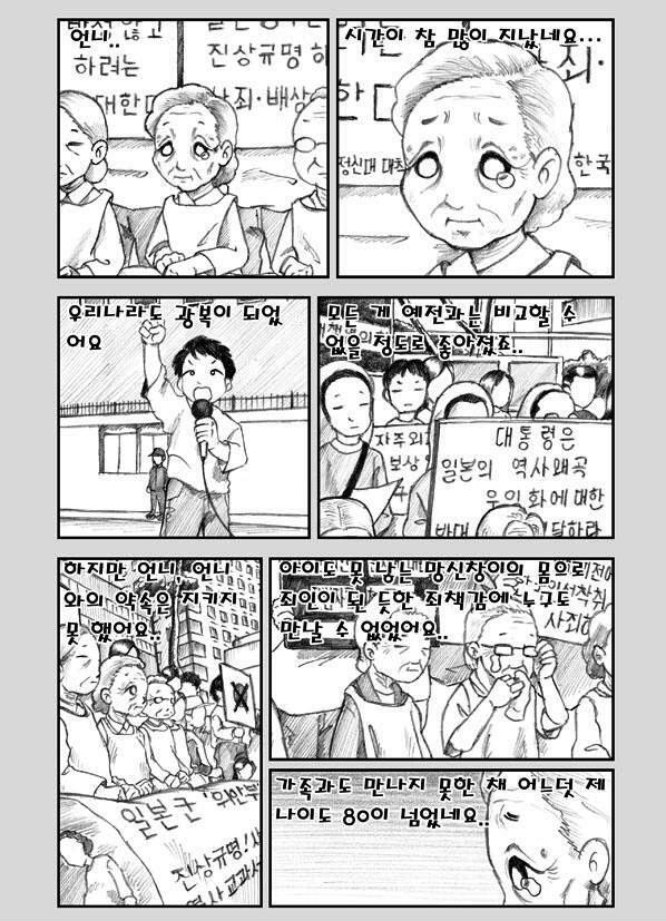 近年は教科書だけでなく、マンガなども歴史教材として積極活用されている。小学校教師、クォン・テソン氏原作の『生まれ変わって花に』は、少女の慰安婦が主人公。慰安所での日本兵の蛮行を描いたマンガだ。