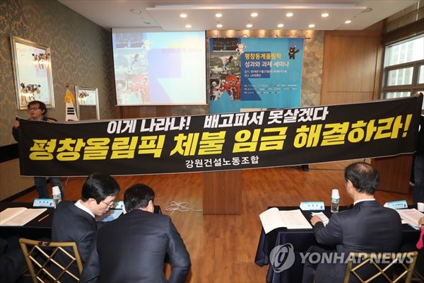 グランドスタンド(臨時観覧席)設置会社とコンテナ販売・レンタル会社、江原建設労組など20人は、本日午前にソウル市中区のLWコンベンションセンターで行われた平昌冬季オリンピックの成果と課題セミナーで奇襲デモを行った。これらは、ソン・ギョンニュン経済人文社会研究会理事長の開会の辞が終わった後、〈平昌オリンピック未払い代金解決せよ〉、〈特別監査を実施せよ〉、〈正当な代価を支払え〉などが書かれた垂れ幕と手立て札を持ってデモを行った。