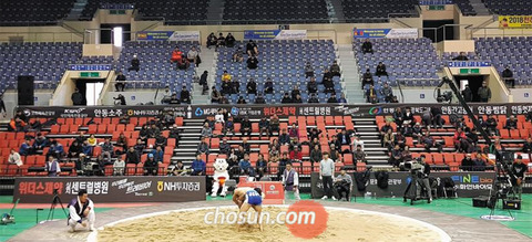 「IBK企業銀行2018天下壮士シルム大会」が開幕した21日、慶尚北道安東市内の安東体育館。土俵を取り囲んで見ていたシルム関係者らから深いため息が漏れた。開幕式と太白壮士(80キログラム以下)級の決勝戦が行われる日だったが、6600人収容できる体育館の入場者数はたった400人だった。今回の大会に出場した選手(700人)の方が観客よりも多かった。