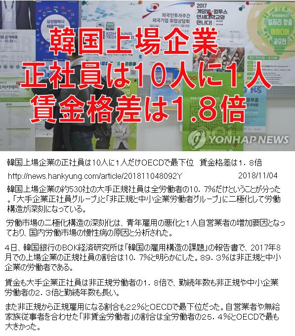 【韓国経済】 韓国の上場企業社員500人以上の正社員は10人に1人だけ 2018/11/02