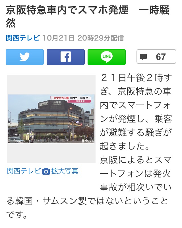 1名無し2016/10/23(Sun) 11:53:34ID:A1NzY3MzE(1/1)NG報告출처: 일본뉴스http://headlines.yahoo.co.jp/hl?a=20161021-00000005-kantelev-l26케이한특급 데마치야나기역(쿄토)에서 출발한 열차내에 누군가 두고 내린 스마트폰에서 연기가 나기 시작해 300명이 피난했다.핸드폰 폭발이 유행인가?>>4>>59>>740