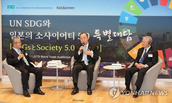 29日、ソウル蚕室(チャムシル)ロッテワールドタワーで開かれた「UN SDG(持続可能開発目標)と日本のソサエティ5.0特別対談」で、潘基文前UN事務総長(中央)が発言している。左はグォンテシン全国経済人連合会副会長、右は中西宏明、日本経済団体連合会会長。