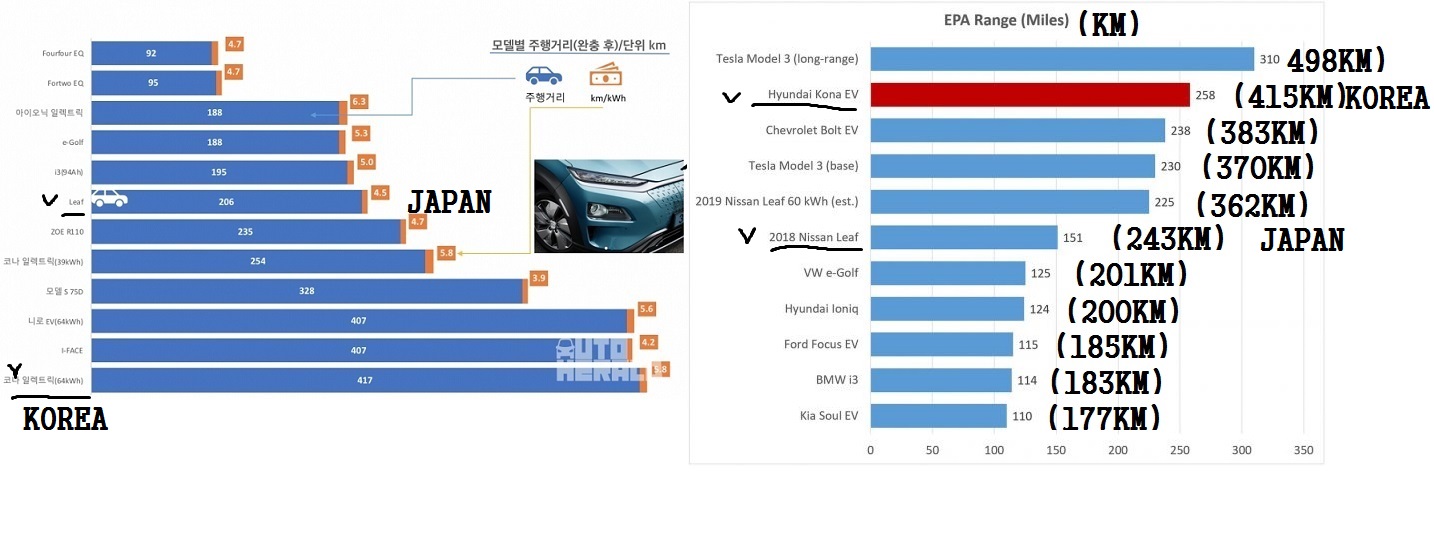 2018年 電気車EV 実走距離,世界1位 韓国416km,日本243km