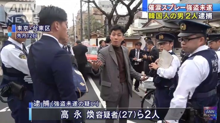 産経新聞インターネット版とTV朝日は韓国人Aさん(27)とBさん(27)の検挙ニュースを報じた。これら先月12日、東京台東区の一貴金属店で5000万円(4億9000万ウォン)に入れられた袋を持った男性に催涙弾スプレーを分散させバッグを奪おうとした疑いを受けている。Aさんなどは、後に近くの屋上のアパートに逃げ、警備員に発見され、住宅侵入罪に適用受けることになった。
