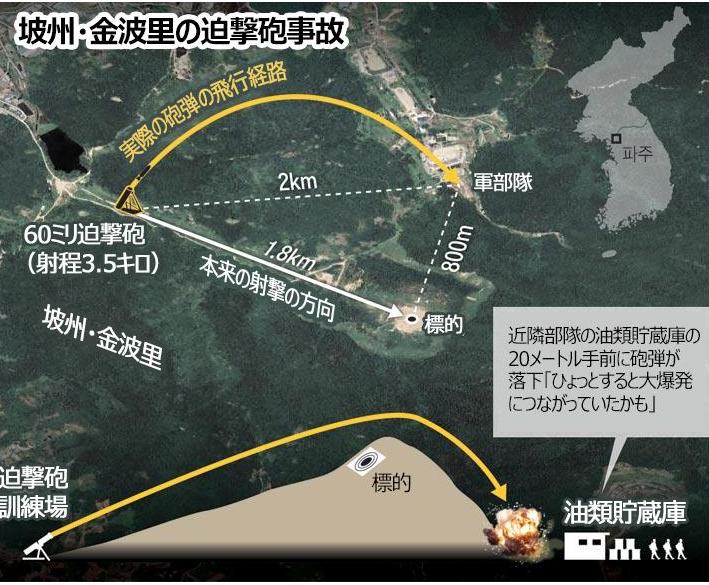 韓国軍が訓練中に撃った迫撃砲弾2発が、ほかの部隊の営内に落下するという事故が発生した。人命被害はなかったが、砲弾は部隊の油類貯蔵庫の20メートル手前に着弾しており、火災など大きな被害につながりかねなかった。軍による調査の結果、迫撃砲を撃った部隊は事前訓練、安全点検など迫撃砲を撃つ前に守るべき基本手順を無視していたことが判明した。