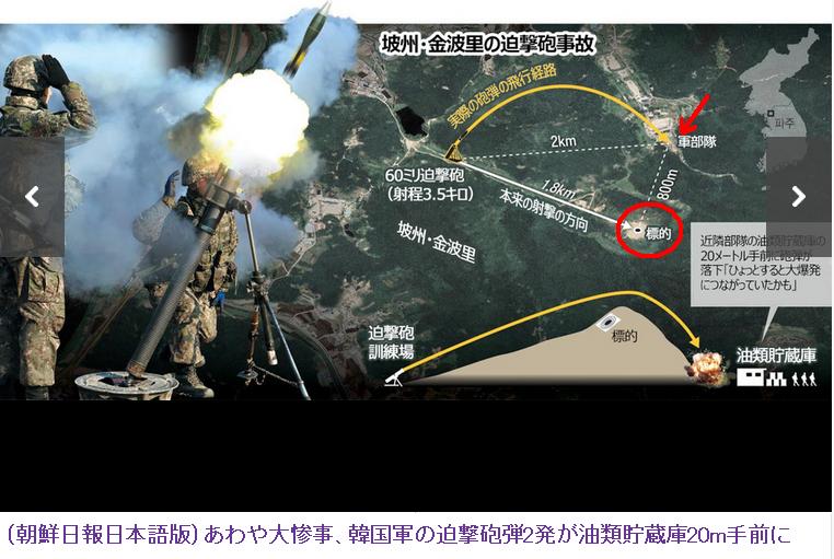 韓国軍、訓練中に迫撃砲で油類貯蔵庫20m手前をうっかり攻撃する