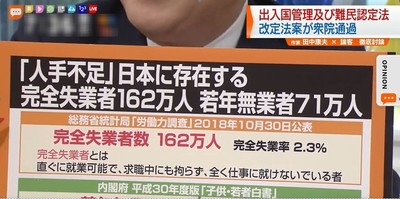 政府は、2019年からの5年間で最大34万5,000人の外国人労働者の受け入れを見込んでいるとの試算を示しています。これについて、田中さんは「そもそも日本は人手不足なのか」と問いかけました。というのも、総務省統計局が公表している「労働力調査」によると、すぐに就業可能で、求職中にもかかわらず全く仕事に就けないでいる“完全失業者”が国内には162万人もいると言います。このような現状を踏まえ、次のように主張しました。