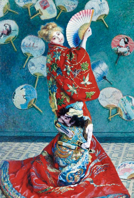 代表的な印象派の画家クロード・モネ(Claude Monet・1840~1926)が妻のカミーユ(Camille)をモデルに描いた大型肖像画だ。カミーユは厚い反物に険しい表情の日本武士が刺繍された真っ赤な着物をまとって、畳の上で踊るように身体を回して立っている。周囲に広がる様々なうちわにはすべて色とりどりな日本の彩色木版画である浮世絵がついている。