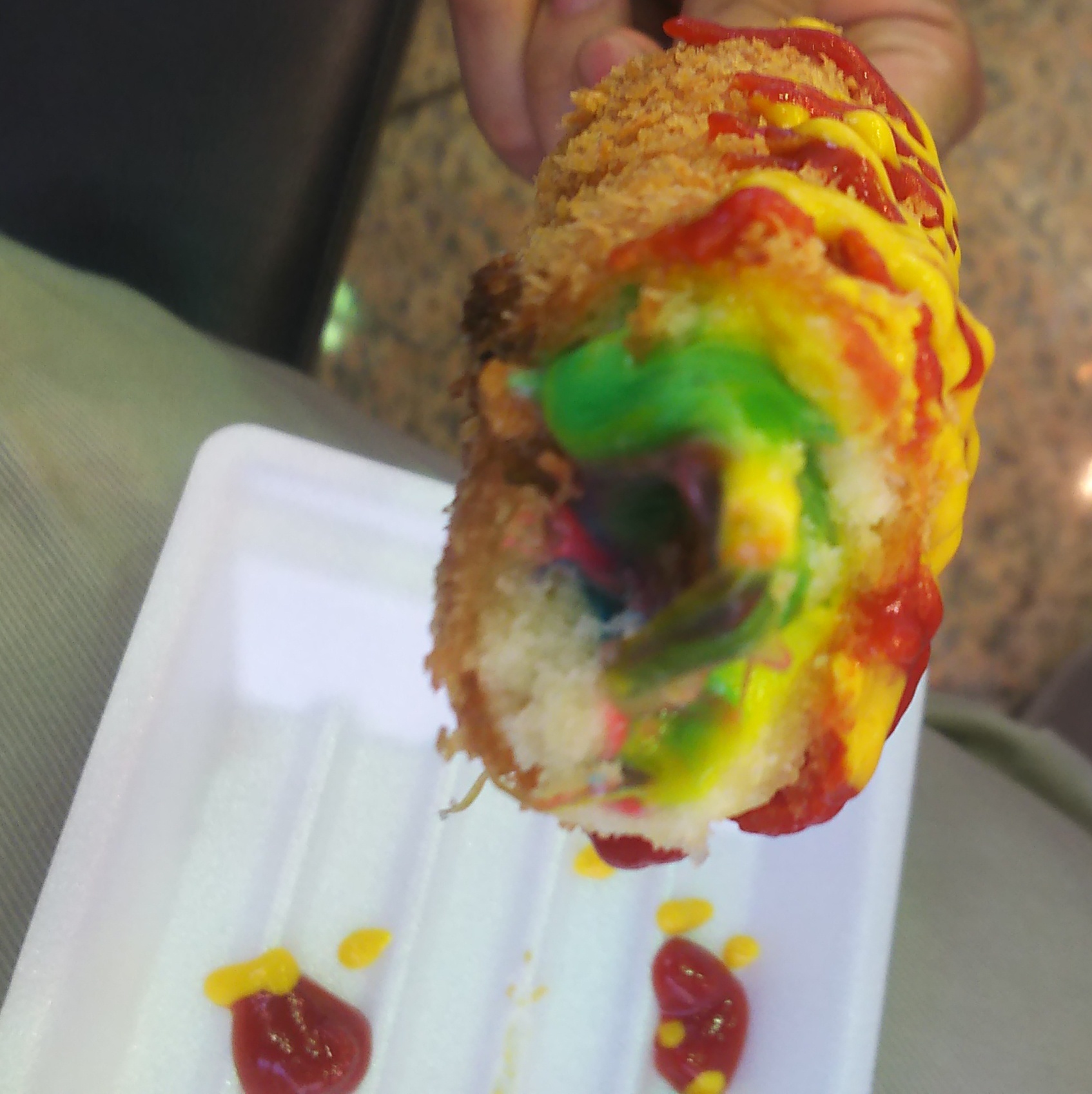 着色したチーズ(ピザ用の細かいチーズ?)を入れたアメリカンドッグ。