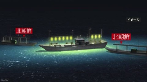【コバンザメ】北朝鮮イカ釣り漁船、集魚灯がないので日本漁船のまわりで操業