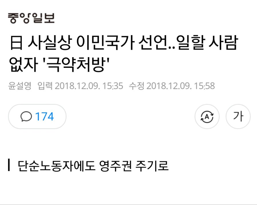 일본이 외국인에게 사실상 이민자에 준하는 거주 자격을 주는 등 외국인 노동자를 대폭 늘리는 출입국관리법안을 통과시켰다. 이에 따라 아베 내각은 내년 4월부터 5년간 34만5150명의 외국인 노동자를 수용하는 계획을 이달 중 확정할 방침이다.
