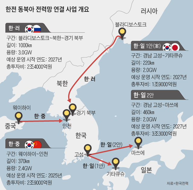 北東アジア電力網接続事業は南北の中国・ロシア・日本が電力網を接続して、韓国は、中国・ロシアからの電力を輸入し、日本に輸出するものである。過去2011年福島原発事故以来、孫正義ソフトバンク会長が初めて主張した後に、「北東アジアスーパーグリッド」と呼ばれている計画である。しかし、各国の利害関係が異なり、北朝鮮を経由する現実的な限界があり、遅々として進まない状態だった。