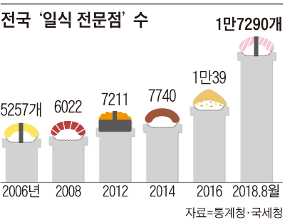 2006年に5272店だった「和食専門店」の数は、今年8月に1万7290店と3倍以上に増えた。ソウル市内の弘大入口駅・江南駅・ソウル大入口駅など若者が多く訪れる街には、日本風の建物に日本語の看板をつけた飲食店が並んでいる。20-30代の若者や外国人観光客の間で、弘大入口は「韓国のジャパンタウン」として有名だ。弘大入口、つまり弘益大学前の通りには和食専門店や日本風のスイーツ店が軒を連ねている。
