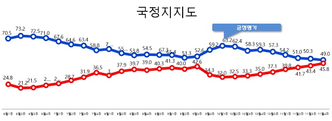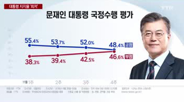 世論調査機関リアルメーターがtbs依頼で過去10〜12日、全国19歳以上の有権者1000 508人を対象に調査(95%の信頼水準で標本誤差±2.5%ポイント)した結果、ドア大統領の国政支持率は前週より1.4%ポイント下げた48.1%と集計された。