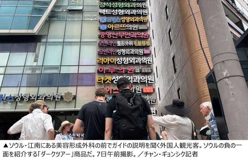 「私教育(塾や習い事など)1番地」と言われるほどの過剰な教育熱、高騰が続き天井知らずの住宅価格、次から次へとオープンする美容形成外科や美容皮膚科など、韓国社会の負の部分が集約されたソウル・江南区が、「ダークツーリズム」の対象となっている。ダークツーリズムとは本来、歴史的な悲劇や災害の現場、犯罪の現場などを訪れる観光のことだ。一部の外国人観光客は「これまでは韓国ドラマやK-POPなどの話ばかり聞いていたが、韓国社会の裏側の話も聞くことができて興味深い」と話した。しかし、一部の旅行商品は韓国社会を過度に批判的な目で見ており、これに対する批判も少なくない。
