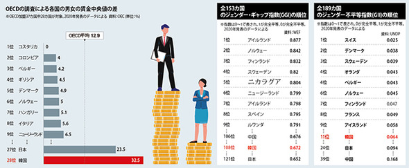 一方GGIは、男女の格差を相対評価して計算する。経済活動参加率、識字率、教育率、出生性比、期待寿命、国会議員および政府閣僚の割合の男女格差を指標として用いて算出する。男女の格差であるため、男女ともに絶対的な数値が低くても、格差が相対的に小さければ点数が高くなり得る。韓国と日本は、国会議員および閣僚の割合などが基となる政治的権限指標で、調査対象153カ国中、韓国が79位、日本が144位と下位圏となっている。- 70