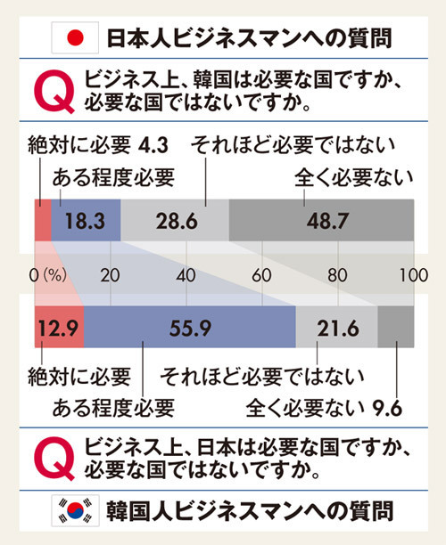 韓国が必要と答えている日本人ビジネスマンは20%しかいないのに、日本が必要と答えている韓国人ビジネスマンは67%、つまり2/3もいるのだな。ここに来る韓国人は「日本なんてもう必要ない」とか言ってたけど、