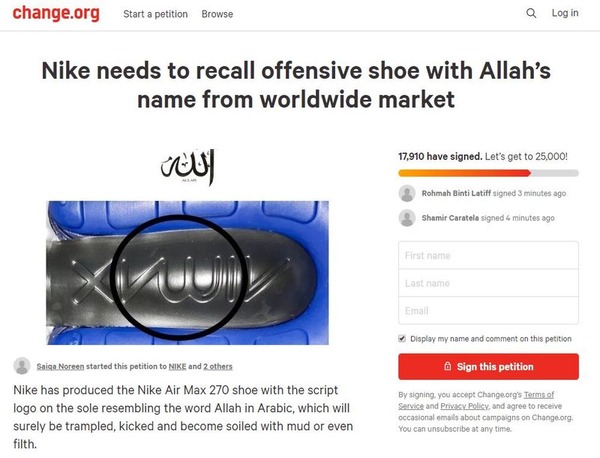 靴底にあるロゴのデザインがアラビア語で「アッラー(神)」を意味する言葉に似ているとして、