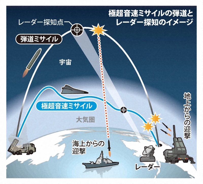 極超音速ミサイルは、音速の5倍以上(マッハ5、時速約6000キロ)の速さで飛び、軌道が変化する特性を持つ。弾道ミサイルは基本的に宇宙空間に打ち上げられてから落下する弓なりの軌道を描くのに対し、極超音速ミサイルは高度100キロ以下の比較的低い高度を飛ぶ。低く飛ぶほど通常の地上・海上のレーダーに捕捉されにくく、探知されても自由に軌道を変えられるという。