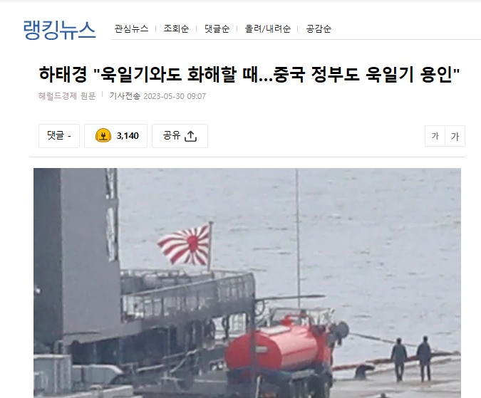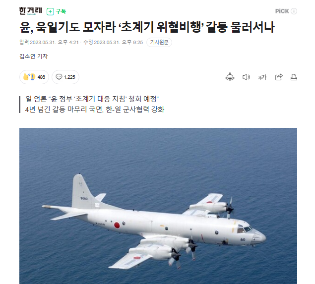 尹錫悦政府が「旭日旗」を掲げた日本の海上自衛隊の護衛艦入港を許容したのに続き、4年以上葛藤していた「哨戒機威嚇飛行」問題でも当時軍が作った対応指針を撤回することにするなど一歩退く計画だと伝えられた。韓日軍事協力を妨げていた2つの障害物である「旭日旗」と「哨戒機問題」の両方が韓国の譲歩で解決される格好だ。