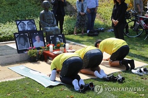 後は、アイディア出して「アヘ顔ダブルピース」にしてみるとか、「1回○○ウォン!サービス中」て看板持たせてみるとか、寝転んで、股開いた格好にした像にしといて、男が股の間で、記念撮影出来る様にしとくとか、何かちょっとでも工夫しろよ!