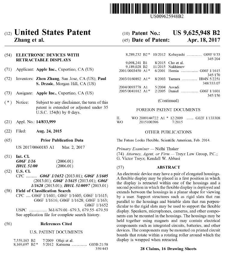 そんなAppleが、巻物のようにクルクル丸められるディスプレを備えるデバイスに関する技術を考案。この技術を米国特許商標庁(USPTO)へ出願したところ、米国時間4月18日に「ELECTRONIC DEVICES WITH RETRACTABLE DISPLAYS」(特許番号「US 9,625,948 B2」)として登録された。出願日は2015年8月24日、公開日は2017年3月2日(公開特許番号「US 2017/0060183 A1」)。この手のディスプレイは10年くらい前に流行ったんだよね。