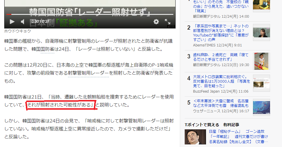 ところが、24日になると、韓国の「軍関係者」の非公式な説明として、射撃統制レーダーは使用していなかったと説明を変えた。
