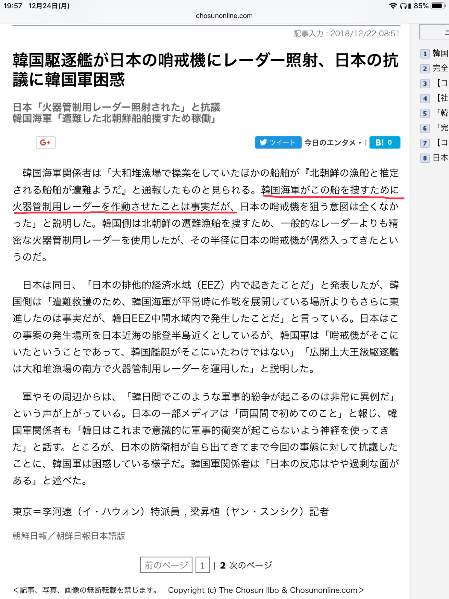 《韓国国防省は21日、「当時、遭難した北朝鮮船舶を捜索するためにレーダーを使用していて、それが照射された可能性がある」と説明していた。》
