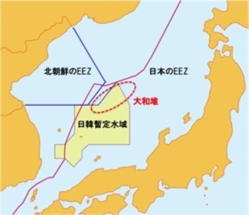 大和堆(やまとたい)の南側は日韓漁業協定での「暫定海域」 = 韓国の漁船の操業は規制されない(残念ながら日韓漁業協定が締結されてない現在でも規制されないみたいな)