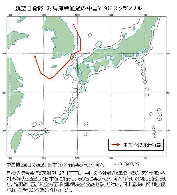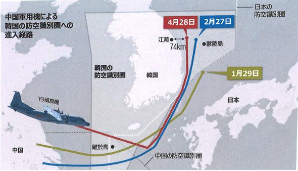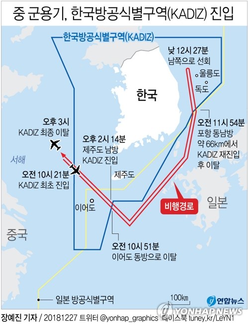 合同参謀は、「今日の午前10時21分頃、中国国籍の軍用機1台済州島西北からKADIZに最初進入して10時51分頃であっても東方に離脱した」とし「以後、日本防空識別区域のJADIZ内側に飛行する、11時54方浦項東南約66kmでKADIZを再入した後、午後12時51分頃離脱した」と明らかにした。