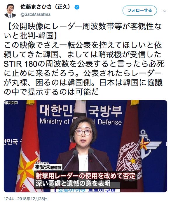 韓国軍関係者も記者団に、「日本側はレーダーを照射されたと言いながら、周波数の特性を一つも公開していない」と述べ、証拠は不十分との認識を示した。むしろ海上自衛隊のP1哨戒機が駆逐艦の上空150メートルまで接近するなど、韓国側に「相当な脅威」を与えていたと主張した。