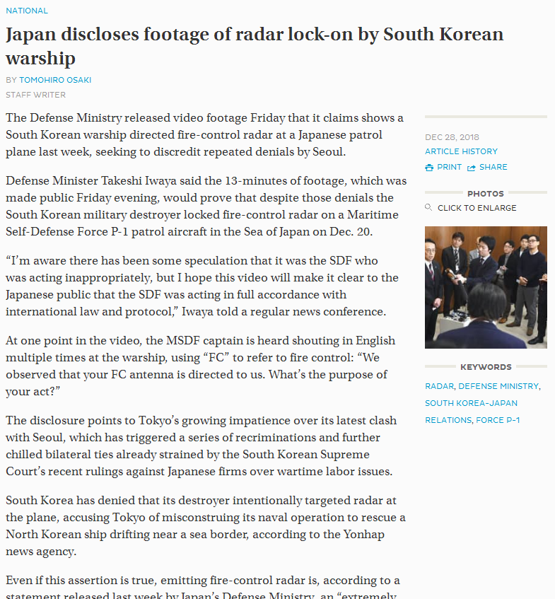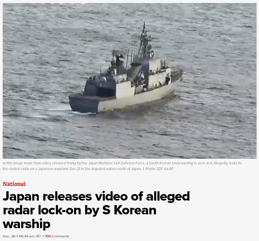 ■韓国は当初「北朝鮮の漁船を捜索するためにレーダーを使った」と主張した。そして今は「日本の哨戒機が危険な低空飛行をしてたから」と主張してる。最初の嘘くらいはつき通そうや。 +4