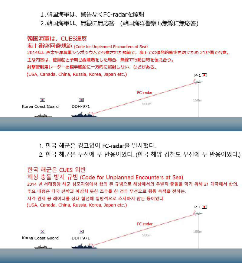 国防省は「動画で見られたように、韓国軍が当時、公海上で遭難漁船を救助している人道主義的な状況で、日本の哨戒機が低空威嚇飛行をした行為自体が非常に危険な行為だ」と主張。さらに、韓国艦は哨戒機にレーダーを照射していないと強調し「日本はこれ以上、事実を歪曲(わいきょく)する行為を中断し、救助活動中だった韓国艦艇に危険な低空飛行をしたことを謝罪せねばならず、実務協議を進めることを求める」と訴えた。