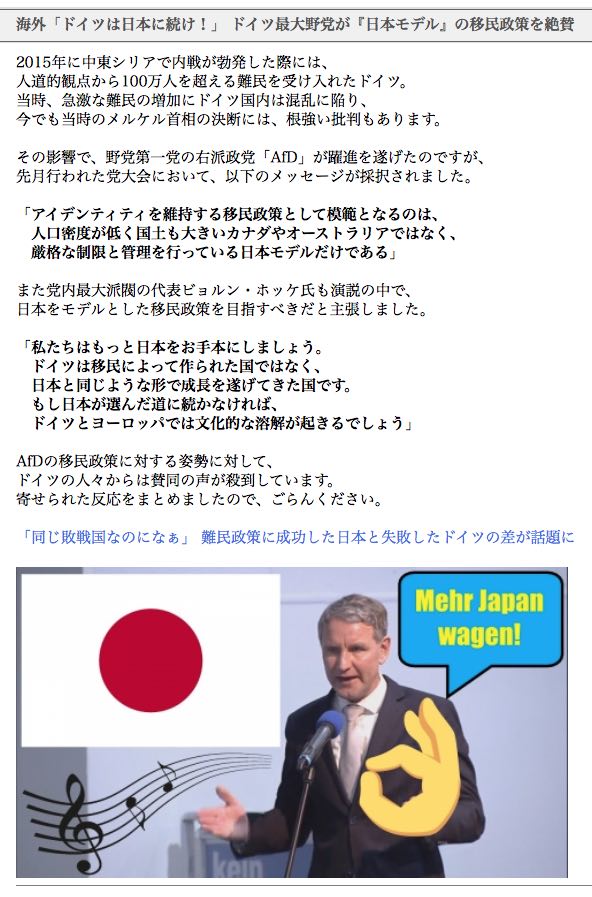 ttp://kaigai○nohannoublog.blog55.fc2.com/blog-entry-3812.html>>38 の続き。ドイツの野党AfDのホッケ党首の「日本を見習え」発言に対するドイツ人の反応