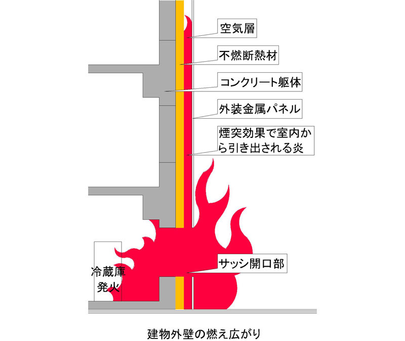 石膏ボード・発泡スチロール・石膏ボードといったサンドイッチ構造になってるが、ボードが割れて発泡スチロールに引火したら、建物全体が燃える。