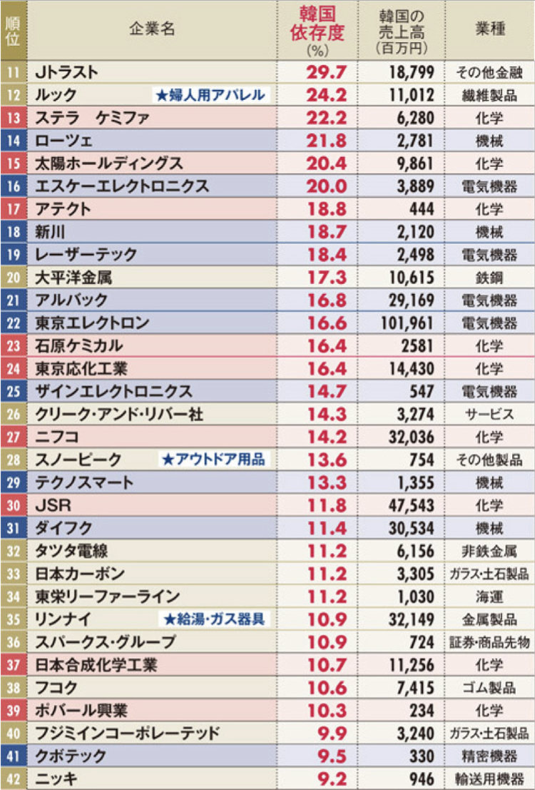 下表は、韓国依存度の高い日系企業をランキングしたものだ。これを見ると断交したとしても、日本にはそれほど影響はないな
